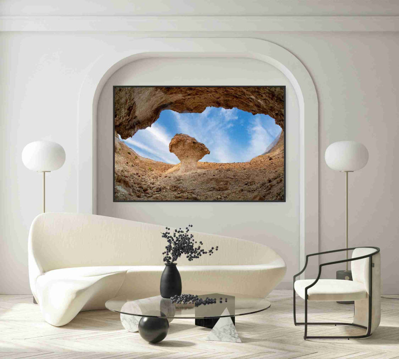لوحة لصخور الفطر في قرية الياء التابعة لولاية قريات في محافظة مسقط مطبوعة على كانفس وبها برواز ملون حسب اختيارك